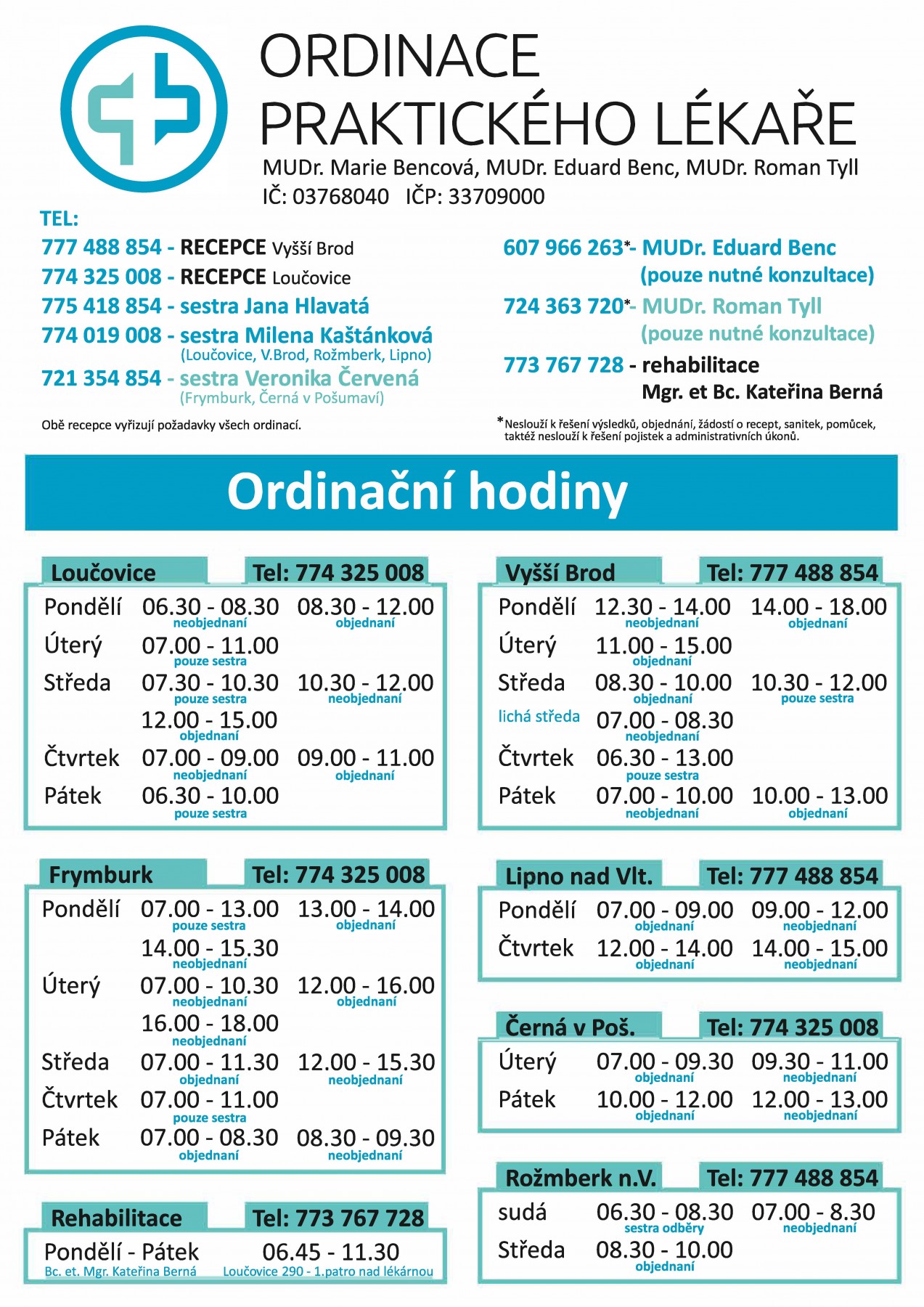 | Úterý | 7:00-10:00 neobjednaní Dr. Benc | 12:00 - 16:00 objednaní | 16:00 - 18:00 neobjednaní |
